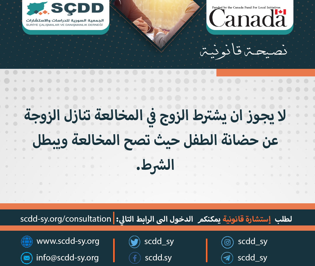 لا يجوز ان يشترط الزوج في المخالعة تنازل الزوجة عن حضانة الطفل حيث تصح المخالعة ويبطل الشرط.