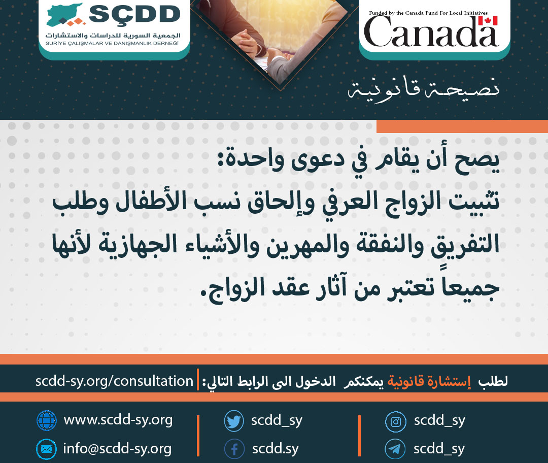 يصح أن يقام في دعوى واحدة: تثبيت الزواج العرفي وإلحاق نسب الأطفال وطلب التفريق والنفقة والمهرين والأشياء الجهازية لأنها جميعاً تعتبر من آثار عقد الزواج.
